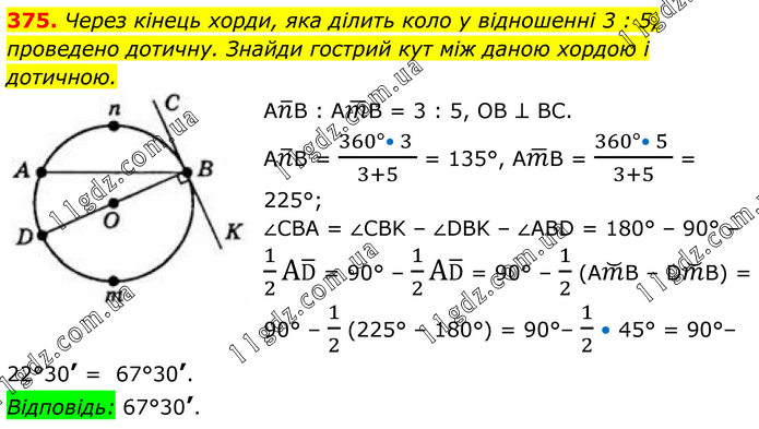375. Через кінець хорди, яка ділить коло у відношенні 3 : 5, проведено дотичну. Знайди гострий кут між даною хордою і дотичною. An ̅B : Am ̅B = 3 : 5, OB ⊥ BC. An ̅B = (360°• 3 )/(3+5) = 135°, Am ̅B = (360°• 5 )/(3+5) = 225°; ∠CBA = ∠CBK – ∠DBK – ∠ABD = 180° – 90° – 1/2 AD ̅ = 90° – 1/2 AD ̅ = 90° – 1/2 (Am ̆B – Dm ̆B) = 90° – 1/2 (225° – 180°) = 90°– 1/2 • 45° = 90°– 22°30’ = 67°30’. Відповідь: 67°30’.