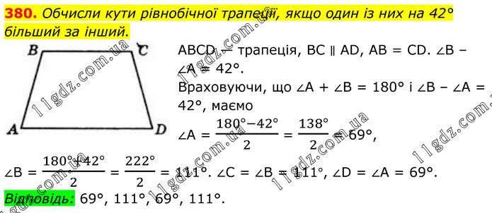 380. Обчисли кути рівнобічної трапеції, якщо один із них на 42° більший за інший. ABCD — трапеція, BC ∥ AD, AB = CD. ∠B – ∠A = 42°. Враховуючи, що ∠A + ∠B = 180° і ∠B – ∠A = 42°, маємо ∠A = (180°-42°)/2 = (138°)/2 = 69°, ∠B = (180°+42°)/2 = (222°)/2 = 111°. ∠C = ∠B = 111°, ∠D = ∠A = 69°. Відповідь: 69°, 111°, 69°, 111°.