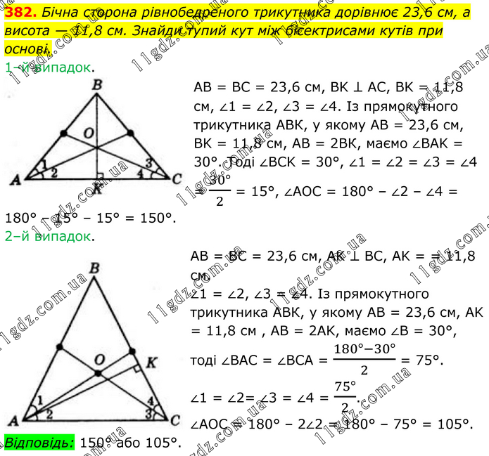 382. Бічна сторона рівнобедреного трикутника дорівнює 23,6 см, а висота — 11,8 см. Знайди тупий кут між бісектрисами кутів при основі. 1–й випадок. AB = BC = 23,6 см, BK ⊥ AC, BK = 11,8 см, ∠1 = ∠2, ∠3 = ∠4. Із прямокутного трикутника АВК, у якому AB = 23,6 см, BK = 11,8 см, AB = 2ВК, маємо ∠BAK = 30°. Тоді ∠BCK = 30°, ∠1 = ∠2 = ∠3 = ∠4 = (30°)/2 = 15°, ∠AOC = 180° – ∠2 – ∠4 = 180° – 15° – 15° = 150°. 2–й випадок. AB = BC = 23,6 см, AK ⊥ BC, AK = = 11,8 см. ∠1 = ∠2, ∠3 = ∠4. Із прямокутного трикутника АВК, у якому AB = 23,6 см, AK = 11,8 см , AB = 2AK, маємо ∠B = 30°, тоді ∠BAC = ∠BCA = (180°-30°)/2 = 75°. ∠1 = ∠2= ∠3 = ∠4 = (75°)/2. ∠AOC = 180° – 2∠2 = 180° – 75° = 105°. Відповідь: 150° або 105°.