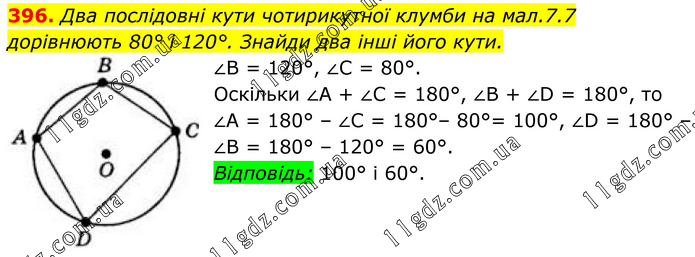 396. Два послідовні кути чотирикутної клумби на мал.7.7 дорівнюють 80° і 120°. Знайди два інші його кути. ∠B = 120°, ∠C = 80°. Оскільки ∠А + ∠C = 180°, ∠B + ∠D = 180°, то ∠А = 180° – ∠C = 180°– 80°= 100°, ∠D = 180° – ∠B = 180° – 120° = 60°. Відповідь: 100° і 60°.