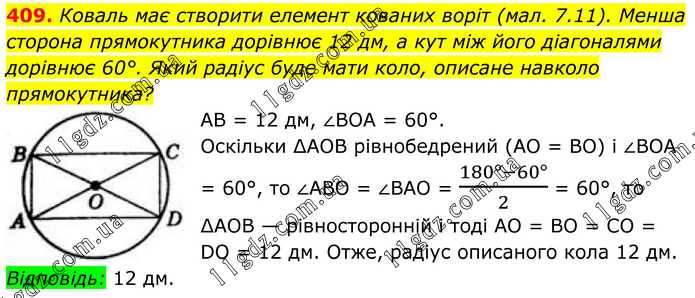 409. Коваль має створити елемент кованих воріт (мал. 7.11). Менша сторона прямокутника дорівнює 12 дм, а кут між його діагоналями дорівнює 60°. Який радіус буде мати коло, описане навколо прямокутника? AB = 12 дм, ∠BOA = 60°. Оскільки ∆AOB рівнобедрений (AO = BO) і ∠BOA = 60°, то ∠ABO = ∠BAO = (180°-60°)/2 = 60°, то ∆AOB — рівносторонній і тоді AO = BO = CO = DO = 12 дм. Отже, радіус описаного кола 12 дм. Відповідь: 12 дм.