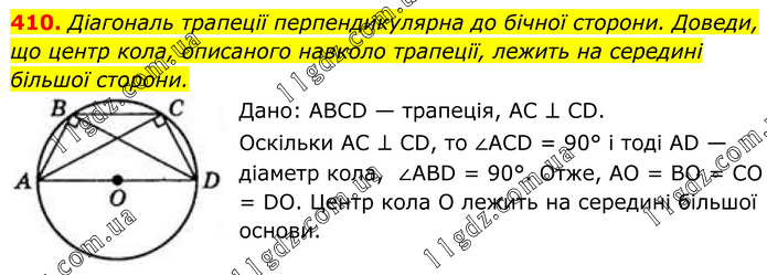 410. Діагональ трапеції перпендикулярна до бічної сторони. Доведи, що центр кола, описаного навколо трапеції, лежить на середині більшої сторони. Дано: ABCD — трапеція, AC ⊥ CD. Оскільки AC ⊥ CD, то ∠ACD = 90° і тоді AD — діаметр кола, ∠ABD = 90°. Отже, AO = BO = CO = DO. Центр кола O лежить на середині більшої основи.