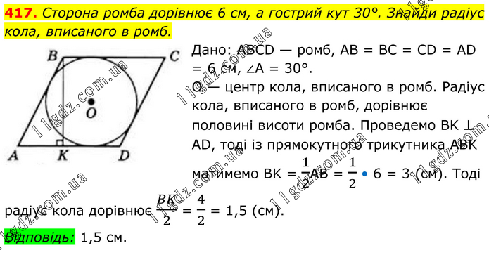 417. Сторона ромба дорівнює 6 см, а гострий кут 30°. Знайди радіус кола, вписаного в ромб. Дано: ABCD — ромб, AB = BC = CD = AD = 6 см, ∠A = 30°. O — центр кола, вписаного в ромб. Радіус кола, вписаного в ромб, дорівнює половині висоти ромба. Проведемо BK ⊥ AD, тоді із прямокутного трикутника ABK матимемо BK = 1/2AB = 1/2 • 6 = 3 (см). Тоді радіус кола дорівнює BK/2 = 4/2 = 1,5 (см). Відповідь: 1,5 см.