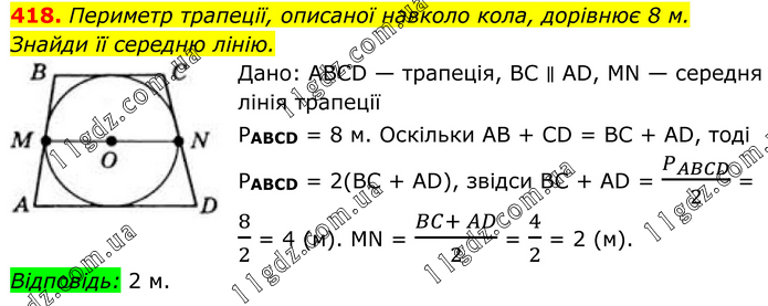 418. Периметр трапеції, описаної навколо кола, дорівнює 8 м. Знайди її середню лінію. Дано: ABCD — трапеція, BC ∥ AD, MN — середня лінія трапеції PABCD = 8 м. Оскільки AB + CD = BC + AD, тоді PABCD = 2(ВС + AD), звідси BC + AD = P_ABCD/2 = 8/2 = 4 (м). MN = (BC+ AD)/2 = 4/2 = 2 (м). Відповідь: 2 м.