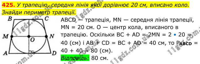 425. У трапецію, середня лінія якої дорівнює 20 см, вписано коло. Знайди периметр трапеції. ABCD — трапеція, MN — середня лінія трапеції, MN = 20 см. O — центр кола, вписаного в трапецію. Оскільки ВС + AD = 2MN = 2 • 20 = 40 (см) і AB + CD = BC + AD = 40 см, то PABCD = 40 + 40 = 80 (см). Відповідь: 80 см.