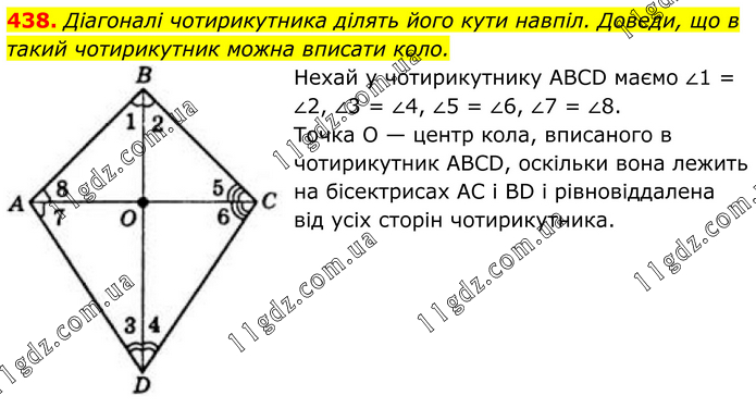 438. Діагоналі чотирикутника ділять його кути навпіл. Доведи, що в такий чотирикутник можна вписати коло. Нехай у чотирикутнику ABCD маємо ∠1 = ∠2, ∠3 = ∠4, ∠5 = ∠6, ∠7 = ∠8. Точка O — центр кола, вписаного в чотирикутник ABCD, оскільки вона лежить на бісектрисах AC і BD і рівновіддалена від усіх сторін чотирикутника.