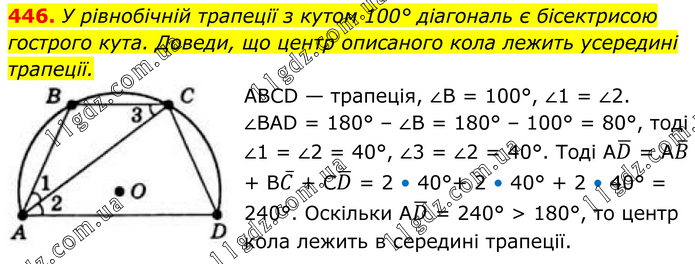 446. У рівнобічній трапеції з кутом 100° діагональ є бісектрисою гострого кута. Доведи, що центр описаного кола лежить усередині трапеції. ABCD — трапеція, ∠B = 100°, ∠1 = ∠2. ∠BAD = 180° – ∠B = 180° – 100° = 80°, тоді ∠1 = ∠2 = 40°, ∠3 = ∠2 = 40°. Тоді AD ̅ = AB ̅ + BC ̅ + CD ̅ = 2 • 40°+ 2 • 40° + 2 • 40° = 240°. Оскільки AD ̅ = 240° > 180°, то центр кола лежить в середині трапеції.