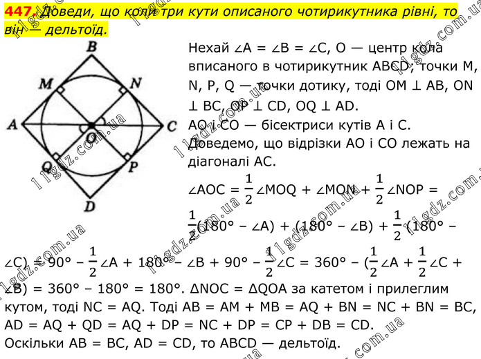 447. Доведи, що коли три кути описаного чотирикутника рівні, то він — дельтоїд. Нехай ∠A = ∠B = ∠C, O — центр кола вписаного в чотирикутник ABCD; точки М, N, Р, Q — точки дотику, тоді OM ⊥ AB, ON ⊥ BC, OP ⊥ CD, OQ ⊥ AD. AO і CO — бісектриси кутів A i С. Доведемо, що відрізки AO і CO лежать на діагоналі AC. ∠AOC = 1/2∠MOQ + ∠MON + 1/2∠NOP = 1/2(180° – ∠A) + (180° – ∠B) + 1/2 (180° – ∠C) = 90° – 1/2∠A + 180° – ∠B + 90° – 1/2∠C = 360° – (1/2∠A + 1/2∠C + ∠B) = 360° – 180° = 180°. ∆NOC = ∆QOA за катетом і прилеглим кутом, тоді NC = AQ. Тоді AB = AM + MB = AQ + BN = NC + BN = BC, AD = AQ + QD = AQ + DP = NC + DP = CP + DB = CD. Оскільки AB = BC, AD = CD, то ABCD — дельтоїд.
