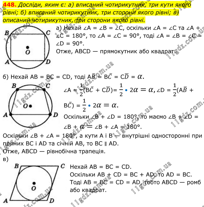 Досліди, яким є: а) вписаний чотирикутник, три кути якого рівні; б) вписаний чотирикутник, три сторони якого рівні; в) описаний чотирикутник, три сторони якого рівні. а) Нехай ∠A = ∠B = ∠C, оскільки ∠A = ∠C та ∠A + ∠C = 180°, то ∠A = ∠C = 90°, тоді ∠A = ∠B = ∠C = ∠D = 90°. Отже, ABCD — прямокутник або квадрат. б) Нехай AB = BC = CD, тоді AB ̅ = BC ̅ = CD ̅ = α. ∠A = 1/2(BC ̅ + CD ̅)= 1/2 • 2α = α,∠D = 1/2(АB ̅ + ВC ̅) = 1/2 • 2α = α. Оскільки ∠В + ∠D = 180°, то маємо ∠B + ∠D = ∠B + α = ∠B + ∠A = 180°. Оскільки ∠B + ∠A = 180°, а кути A і В — внутрішні односторонні при прямих BC і AD та січній AB, то BC ∥ AD. Отже, ABCD — рівнобічна трапеція. в) Нехай AB = BC = CD. Оскільки AB + CD = BC + AD, то AD = BC. Тоді AB = BC = CD = AD, тобто ABCD — ромб або квадрат.