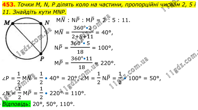 453. Точки M, N, P ділять коло на частини, пропорційні числам 2, 5 і 11. Знайдіть кути MNP. MN ̅ : NP ̅ : MP ̅ = 2 : 5 : 11. MN ̅ = (360°•2)/(2+5+11) = 40°, NP ̅ = (360°• 5)/18 = 100°, MP ̅ = (360°•11)/18 = 220°. ∠P = 1/2 MN ̅ = 1/2 • 40° = 20°, ∠M = 1/2 NP ̅ = 1/2 • 100° = 50°, ∠N = 1/2 MP ̅ = 1/2 • 220° = 110°. Відповідь: 20°, 50°, 110°.