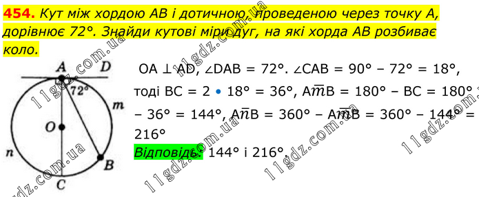 454. Кут між хордою AB і дотичною, проведеною через точку A, дорівнює 72°. Знайди кутові міри дуг, на які хорда AB розбиває коло. OA ⊥ AD, ∠DAB = 72°. ∠CAB = 90° – 72° = 18°, тоді BC = 2 • 18° = 36°, Am ̅B = 180° – BC = 180° – 36° = 144°, An ̅B = 360° – Am ̅B = 360° – 144° = 216°. Відповідь: 144° і 216°.