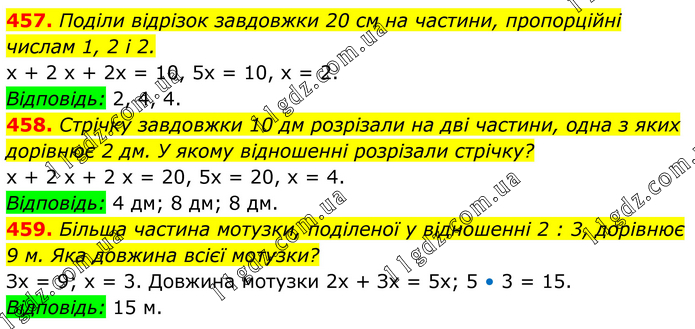 457. Поділи відрізок завдовжки 20 см на частини, пропорційні числам 1, 2 і 2. х + 2 х + 2х = 10, 5х = 10, х = 2. Відповідь: 2, 4, 4. 458. Стрічку завдовжки 10 дм розрізали на дві частини, одна з яких дорівнює 2 дм. У якому відношенні розрізали стрічку? х + 2 х + 2 х = 20, 5х = 20, х = 4. Відповідь: 4 дм; 8 дм; 8 дм. 459. Більша частина мотузки, поділеної у відношенні 2 : 3, дорівнює 9 м. Яка довжина всієї мотузки? Зх = 9; х = 3. Довжина мотузки 2х + Зх = 5х; 5 • 3 = 15. Відповідь: 15 м.