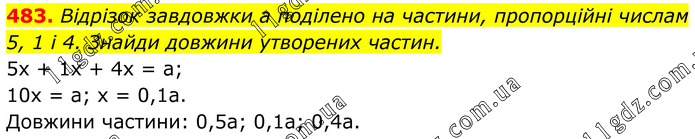 483. Відрізок завдовжки а поділено на частини, пропорційні числам 5, 1 і 4. Знайди довжини утворених частин. 5х + 1x + 4x = а; 10x = a; x = 0,1а. Довжини частини: 0,5а; 0,1а; 0,4а.