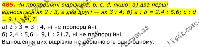 485. Чи пропорційні відрізки а, b, с, d, якщо: а) два перші відносяться як 2 : 3, а два другі — як 3 : 4; б) а : b = 2,4 : 5,6; с : d = 9,1 : 21,7. a) 2 : 3 = 3 : 4, ні не пропорційні. б) 2,4 : 5,6 = 9,1 : 21,7, ні не пропорційні. Відношення цих відрізків не дорівнюють одне одному.