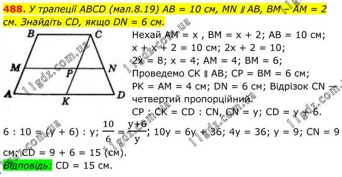 488. У трапеції ABCD (мал.8.19) AB = 10 см, MN ∥ AB, BM – AM = 2 см. Знайдіть CD, якщо DN = 6 см. Нехай АМ = х , BM = х + 2; AB = 10 см; х + х + 2 = 10 см; 2х + 2 = 10; 2х = 8; х = 4; AM = 4; BM = 6; Проведемо СK ∥ AB; CP = BM = 6 см; PK = AM = 4 см; DN = 6 см; Відрізок CN — четвертий пропорційний. CP : СК = CD : CN, CN = y; CD = y + 6. 6 : 10 = (у + 6) : y; 10/6 = (y+6)/y; 10y = 6y + 36; 4у = 36; у = 9; CN = 9 см; CD = 9 + 6 = 15 (см). Відповідь: CD = 15 см.
