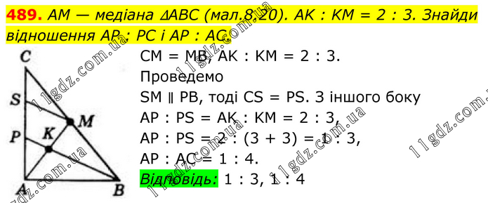 489. AM — медіана ∆ABC (мал.8.20). AK : KM = 2 : 3. Знайди відношення AP : PC і AP : AC. CM = MB, AK : KM = 2 : 3. Проведемо SM ∥ PВ, тоді CS = PS. З іншого боку AP : PS = AK : KM = 2 : 3, АР : PS = 2 : (3 + 3) = 1 : 3, AP : AC = 1 : 4. Відповідь: 1 : 3, 1 : 4.