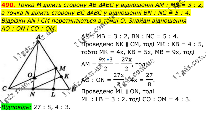 490. Точка M ділить сторону AB ∆ABC у відношенні AM : MB = 3 : 2, а точка N ділить сторону BC ∆ABC у відношенні BN : NC = 5 : 4. Відрізки AN і CM перетинаються в точці O. Знайди відношення AO : ON і CO : OM. AM : MB = 3 : 2, BN : NC = 5 : 4. Проведемо NK ∥ CM, тоді МК : КВ = 4 : 5, тобто MK = 4х, КВ = 5х, МВ = 9х, тоді AM = (9x •3)/2 = 27x/2, тоді AО : ОN = 27x/2 : 4х = 27/8. Проведемо ML ∥ ON, тоді ML : LB = 3 : 2, тоді СО : ОМ = 4 : 3. Відповідь: 27 : 8, 4 : 3.