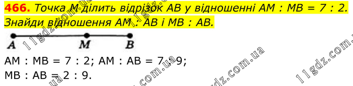 466. Точка М ділить відрізок АВ у відношенні АМ : МВ = 7 : 2. Знайди відношення АМ : АВ і MB : AB. АМ : МВ = 7 : 2; AМ : АВ = 7 : 9; MB : AB = 2 : 9.