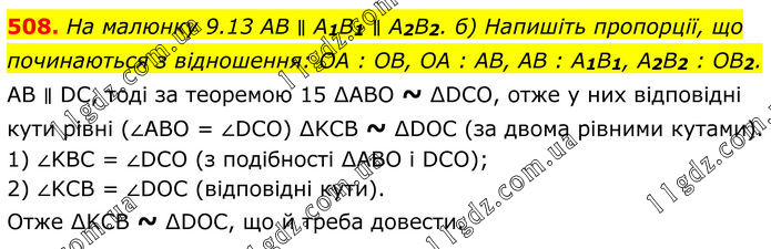 508. На малюнку 9.13 AB ∥ A1B1 ∥ A2B2. б) Напишіть пропорції, що починаються з відношення: OA : OB, OA : AB, AB : A1B1, A2B2 : OB2. AB ∥ DC, тоді за теоремою 15 ∆ABO ~ ∆DCO, отже у них відповідні кути рівні (∠ABO = ∠DCO) ∆KCB ~ ∆DOC (за двома рівними кутами). 1) ∠KBC = ∠DCO (з подібності ∆ABO і DCO); 2) ∠KCB = ∠DOC (відповідні кути). Отже ∆KCB ~ ∆DOC, що й треба довести.
