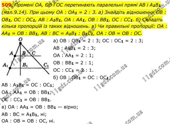 509. Промені OA, OB і OC перетинають паралельні прямі AB і A1B1 (мал.9.14). При цьому OA : OA1 = 2 : 3. а) Знайдіть відношення OB : OB1, OC : OC1, AB : A1B1, OA : AA1, OB : BB1, OC : CC1. б) Складіть кілька пропорцій із таких відношень. в) Чи правильні пропорції: OA : AA1 = OB : BB1, AB : BC = A1B1 : B1C1, OA : OB = OB : OC. a) OB : OB1 = 2 : 3; OC : OC1 = 2 : 3; AB : A1B1 = 2 : 3; OA : AA1 = 2 : 1; OB : BB1 = 2 : 1; OC : CC1 = 2 : 1. б) OB : OB1 = OC : OC1; AB : A1B1 = OC : OC1; OA : AA1 = OB : BB1; OC : CC1 = OB : BB1. в) OA : AA1 = OB : BB1 — вірно; AB : BC = A1B1, ні; OA : OB = OB : OC, ні.