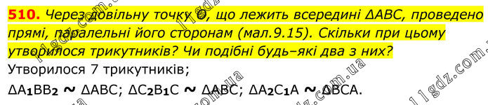 510. Через довільну точку O, що лежить всередині ∆ABC, проведено прямі, паралельні його сторонам (мал.9.15). Скільки при цьому утворилося трикутників? Чи подібні будь–які два з них? Утворилося 7 трикутників; ∆A1BB2 ~ ∆ABC; ∆C2B1C ~ ∆ABC; ∆A2C1A ~ ∆BCA.