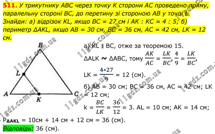 511. У трикутнику ABC через точку K сторони AC проведено пряму, паралельну стороні BC, до перетину зі стороною AB у точці L. Знайди: а) відрізок KL, якщо BC = 27 см і AK : KC = 4 : 5; б) периметр ∆AKL, якщо AB = 30 см, BC = 36 см, AC = 42 см, LK = 12 см. a) KL ∥ BC, отже за теоремою 15. ∆ALK ~ ∆ABC, тому AK/AC = LK/BC, 4/9 = LK/BC, LK = (4•27)/9 = 12 (см). б) AB = 30 cм; BC = 36 см, AC = 42 см; LK = 12 см; k = BC/LK = 36/12 = 3. AL = 10 см; AK = 14 cм; Р∆AKL = 10см + 14 cм + 12 см = 36 (cм). Відповідь: 36 (см).