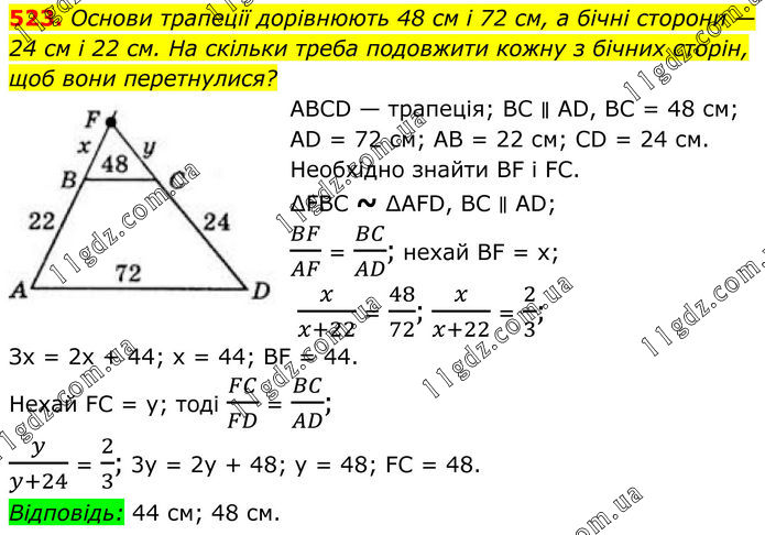 523. Основи трапеції дорівнюють 48 см і 72 см, а бічні сторони — 24 см і 22 см. На скільки треба подовжити кожну з бічних сторін, щоб вони перетнулися? ABCD — трапеція; BC ∥ AD, BC = 48 см; AD = 72 см; AB = 22 см; CD = 24 см. Необхідно знайти BF і FC. ∆FBC ~ ∆AFD, BC ∥ AD; BF/AF = BC/AD; нехай BF = х; x/(x+22) = 48/72; x/(x+22) = 2/3; Зх = 2х + 44; х = 44; BF = 44. Нехай FC = у; тоді FC/FD = BC/AD; y/(y+24) = 2/3; 3y = 2y + 48; y = 48; FC = 48. Відповідь: 44 см; 48 см.