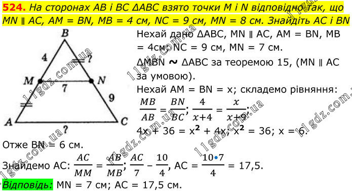 524. На сторонах AB і BC ∆ABC взято точки M і N відповідно так, що MN ∥ AC, AM = BN, MB = 4 см, NC = 9 см, MN = 8 см. Знайдіть AC і BN Нехай дано ∆ABC, MN ∥ AC, AM = BN, MB = 4см; NC = 9 см, MN = 7 см. ∆MBN ~ ∆ABC за теоремою 15, (MN ∥ AC за умовою). Нехай AM = BN = x; складемо рівняння: MB/AB = BN/BC; 4/(x+4) = x/(x+9); 4x + 36 = x2 + 4x; x2 = 36; х = 6. Отже BN = 6 см. Знайдемо AC: AC/MM = AB/MB; AC/7 – 10/4, AC = (10•7)/4 = 17,5. Відповідь: MN = 7 см; AC = 17,5 см.