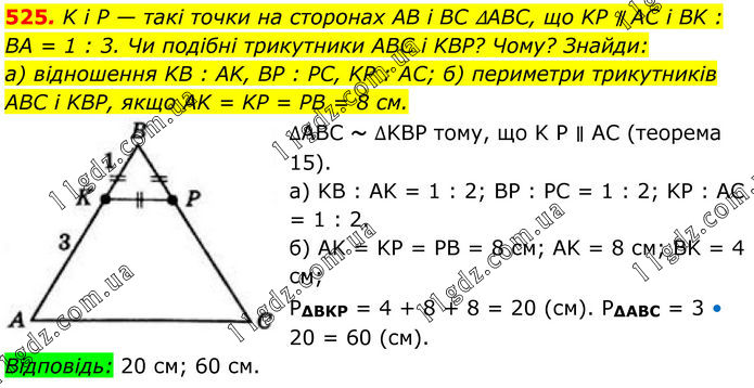525. K і P — такі точки на сторонах AB і BC ∆ABC, що KP ∥ AC і BK : BA = 1 : 3. Чи подібні трикутники ABC і KBP? Чому? Знайди: а) відношення KB : AK, BP : PC, KP : AC; б) периметри трикутників ABC і KBP, якщо AK = KP = PB = 8 см. ∆ABC ~ ∆KBP тому, що K P ∥ AC (теорема 15). a) KB : AK = 1 : 2; BP : PC = 1 : 2; KP : AC = 1 : 2. б) AK = KP = PB = 8 см; AK = 8 см; ВK = 4 см; Р∆BKP = 4 + 8 + 8 = 20 (см). Р∆ABC = 3 • 20 = 60 (см). Відповідь: 20 см; 60 см.