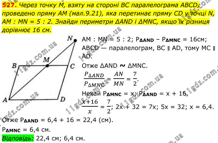 527. Через точку M, взяту на стороні BC паралелограма ABCD, проведено пряму AM (мал.9.21), яка перетинає пряму CD у точці N, AM : MN = 5 : 2. Знайди периметри ∆AND і ∆MNC, якщо їх різниця дорівнює 16 см. AM : MN = 5 : 2; P∆AND – P∆MNC = 16см; ABCD — паралелограм, BC ∥ AD, тому MC ∥ AD. Отже ∆AND ~ ∆MNC. P_∆AND/P_∆MNC = AN/MN = 7/2. Нехай P∆MNC = x; P∆AND = x + 16. (x+16)/x = 7/2; 2x + 32 = 7x; 5x = 32; x = 6,4. Отже P∆AND = 6,4 + 16 = 22,4 (см). P∆MNC = 6,4 см. Відповідь: 22,4 см; 6,4 см.