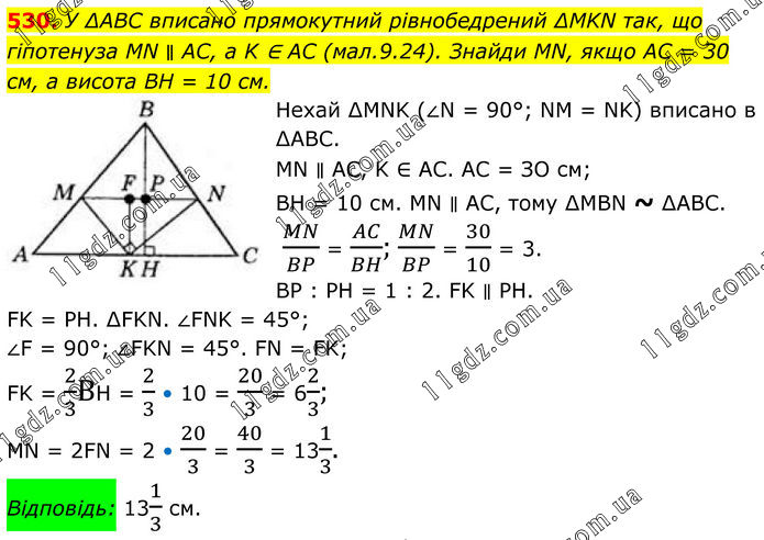 530. У ∆ABC вписано прямокутний рівнобедрений ∆MKN так, що гіпотенуза MN ∥ AC, а K ∈ AC (мал.9.24). Знайди MN, якщо AC = 30 см, а висота BH = 10 см. Нехай ∆MNK (∠N = 90°; NM = NK) вписано в ∆АВС. MN ∥ AC, K ∈ AC. AC = ЗО см; BH = 10 см. MN ∥ AC, тому ∆MBN ~ ∆ABC. MN/BP = AC/BH; MN/BP = 30/10 = 3. BP : PH = 1 : 2. FK ∥ PH. FK = PH. ∆FKN. ∠FNK = 45°; ∠F = 90°; ∠FKN = 45°. FN = FK; FK = 2/3BH = 2/3 • 10 = 20/3 = 62/3; MN = 2FN = 2 • 20/3 = 40/3 = 131/3. Відповідь: 131/3 см.