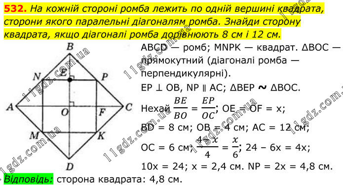 532. На кожній стороні ромба лежить по одній вершині квадрата, сторони якого паралельні діагоналям ромба. Знайди сторону квадрата, якщо діагоналі ромба дорівнюють 8 см і 12 см. ABCD — ромб; MNPK — квадрат. ∆BOC — прямокутний (діагоналі ромба — перпендикулярні). EP ⊥ OB, NP ∥ AC; ∆BEP ~ ∆BOC. Нехай BE/BO = EP/OC; OE = OF = x; BD = 8 см; ОВ = 4 см; AC = 12 см; ОС = 6 см; (4- x)/4 = x/6; 24 – 6x = 4x; 10x = 24; x = 2,4 см. NP = 2x = 4,8 см. Відповідь: сторона квадрата: 4,8 см.