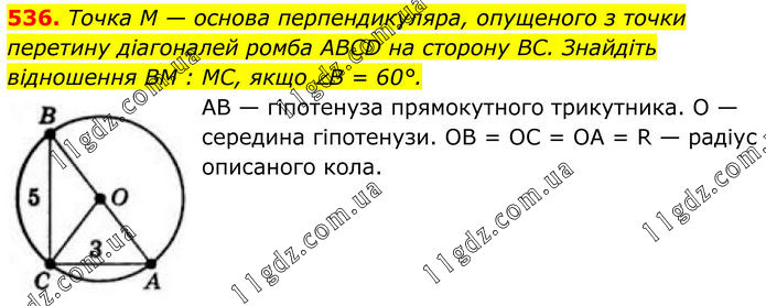 536. Точка M — основа перпендикуляра, опущеного з точки перетину діагоналей ромба ABCD на сторону BC. Знайдіть відношення BM : MC, якщо ∠B = 60°. AB — гіпотенуза прямокутного трикутника. O — середина гіпотенузи. OB = OC = OA = R — радіус описаного кола.