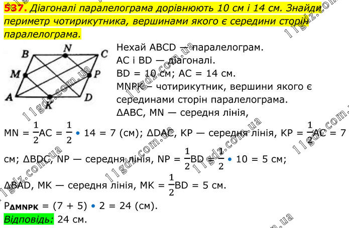 537. Діагоналі паралелограма дорівнюють 10 см і 14 см. Знайди периметр чотирикутника, вершинами якого є середини сторін паралелограма. Нехай ABCD — паралелограм. AC і BD — діагоналі. BD = 10 см; AC = 14 см. MNPK – чотирикутник, вершини якого є серединами сторін паралелограма. ∆АВС, MN — середня лінія, MN = 1/2АС = 1/2 • 14 = 7 (см); ∆DAC, KP — середня лінія, KP = 1/2АС = 7 см; ∆BDC, NP — середня лінія, NP = 1/2BD = 1/2 • 10 = 5 см; ∆BAD, MK — середня лінія, MK = 1/2BD = 5 см. Р∆MNPK = (7 + 5) • 2 = 24 (см). Відповідь: 24 см.