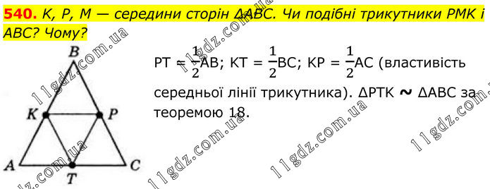 540. K, P, M — середини сторін ∆ABC. Чи подібні трикутники PMK і ABC? Чому? PT = 1/2АВ; KT = 1/2ВС; KP = 1/2АС (властивість середньої лінії трикутника). ∆PTK ~ ∆ABC за теоремою 18.
