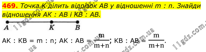 469. Точка К ділить відрізок АB у відношенні m : n. Знайди відношення АК : АВ і КВ : AB. AK : КВ = m : n; AK : AB = m/(m+n); KB : AB = m/(m+n).