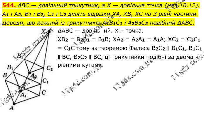 544. ABC — довільний трикутник, а Х — довільна точка (мал.10.12). A1 і A2, B1 і B2, C1 і C2 ділять відрізки XA, XB, XC на 3 рівні частини. Доведи, що кожний із трикутників A1B1C1 і A2B2C2 подібний ∆ABC. ∆ABC — довільний. Х – точка. XB2 = B2B1 = B1B; XA2 = A2A1 = A1A; XC2 = C2C1 = C1C тому за теоремою Фалеса В2С2 ∥ B1С1, B1C1 ∥ BC, B2C2 ∥ BC, ці трикутники подібні за двома рівними кутами.