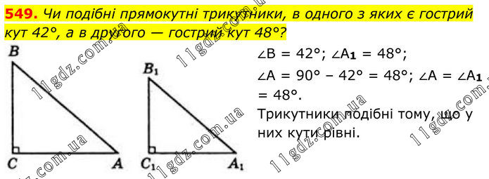 549. Чи подібні прямокутні трикутники, в одного з яких є гострий кут 42°, а в другого — гострий кут 48°? ∠B = 42°; ∠A1 = 48°; ∠А = 90° – 42° = 48°; ∠А = ∠A1 = 48°. Трикутники подібні тому, що у них кути рівні.