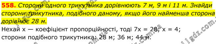 558. Сторони одного трикутника дорівнюють 7 м, 9 м і 11 м. Знайди сторони трикутника, подібного даному, якщо його найменша сторона дорівнює 28 м. Нехай x — коефіцієнт пропорційності, тоді 7x = 28; x = 4; сторони подібного трикутника: 28 м; 36 м; 44 м.