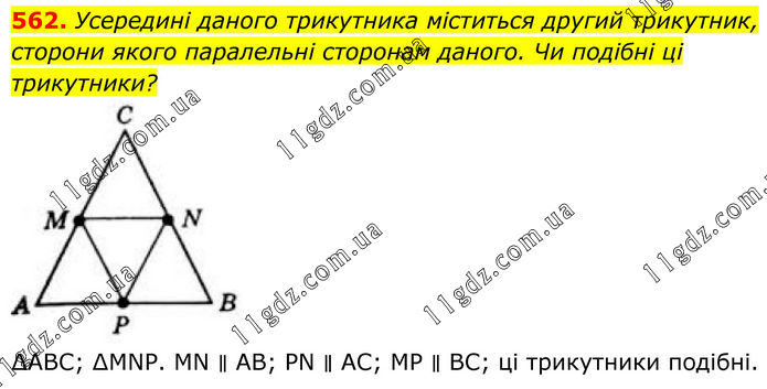 562. Усередині даного трикутника міститься другий трикутник, сторони якого паралельні сторонам даного. Чи подібні ці трикутники? ∆ABC; ∆MNP. MN ∥ AB; PN ∥ AC; MP ∥ BC; ці трикутники подібні.