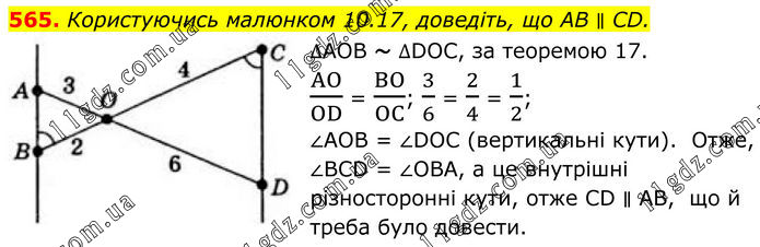 565. Користуючись малюнком 10.17, доведіть, що AB ∥ CD. ∆AOB ~ ∆DOC, за теоремою 17. AO/OD = BO/OC; 3/6 = 2/4 = 1/2; ∠AOB = ∠DOC (вертикальні кути). Отже, ∠BCD = ∠OBA, а це внутрішні різносторонні кути, отже CD ∥ AB, що й треба було довести.
