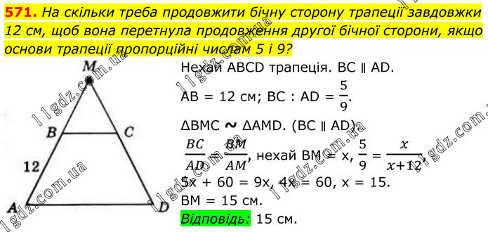 571. На скільки треба продовжити бічну сторону трапеції завдовжки 12 см, щоб вона перетнула продовження другої бічної сторони, якщо основи трапеції пропорційні числам 5 і 9? Нехай ABCD трапеція. BC ∥ AD. AB = 12 см; BC : AD = 5/9. ∆BMC ~ ∆AMD. (BC ∥ AD). BC/AD = BM/AM, нехай BM = x, 5/9 = x/(x+12), 5х + 60 = 9х, 4х = 60, x = 15. BM = 15 см. Відповідь: 15 см.