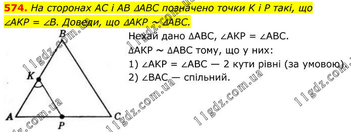 574. На сторонах AC і AB ∆ABC позначено точки K і P такі, що ∠AKP = ∠B. Доведи, що ∆AKP ~ ∆ABC. Нехай дано ∆ABC, ∠АКР = ∠ABC. ∆АКР ~ ∆ABC тому, що у них: 1) ∠AKP = ∠ABC — 2 кути рівні (за умовою). 2) ∠ВАС — спільний.