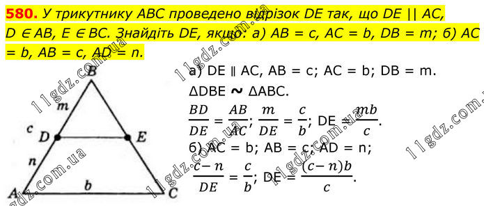 580. У трикутнику ABC проведено відрізок DE так, що DE || AC, D ∈ AB, E ∈ BC. Знайдіть DE, якщо: а) AB = c, AC = b, DB = m; б) AC = b, AB = c, AD = n. a) DE ∥ AC, AB = с; АС = b; DB = m. ∆DBE ~ ∆ABC. BD/DE = AB/AC; m/DE = c/b; DE = mb/c. б) AC = b; AB = c; AD = n; (c- n)/DE = c/b; DE = ((c- n)b)/c.