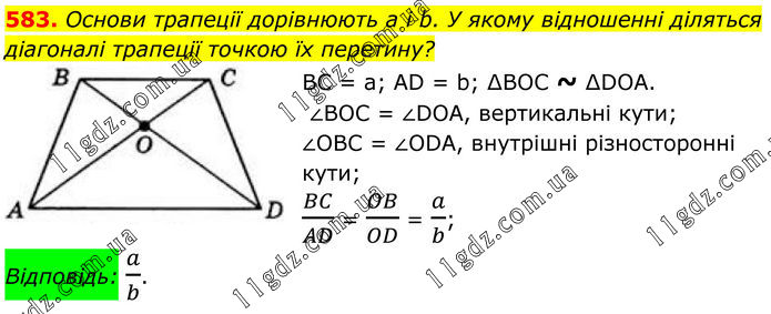583. Основи трапеції дорівнюють a і b. У якому відношенні діляться діагоналі трапеції точкою їх перетину? BC = а; AD = b; ∆BOC ~ ∆DOA. ∠BOC = ∠DOА, вертикальні кути; ∠OBC = ∠ODА, внутрішні різносторонні кути; BC/AD = OB/OD = a/b; Відповідь: a/b.