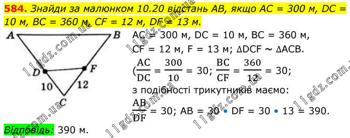 584. Знайди за малюнком 10.20 відстань AB, якщо AC = 300 м, DC = 10 м, BC = 360 м, CF = 12 м, DF = 13 м. AС = 300 м, DC = 10 м, BC = 360 м, CF = 12 м, F = 13 м; ∆DCF ~ ∆ACB. (AC/DC = 300/10 = 30; BC/CF = 360/12 = 30; з подібності трикутників маємо: AB/DF = 30; АВ = 30 • DF = 30 • 13 = 390. Відповідь: 390 м.