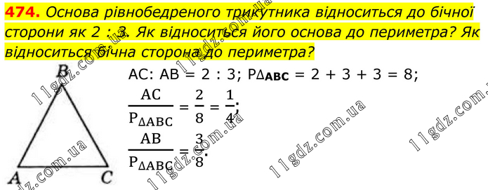 474. Основа рівнобедреного трикутника відноситься до бічної сторони як 2 : 3. Як відноситься його основа до периметра? Як відноситься бічна сторона до периметра? AC: AB = 2 : 3; P∆ABC = 2 + 3 + 3 = 8; AC/P_∆ABC = 2/8 = 1/4; AB/P_∆ABC = 3/8.