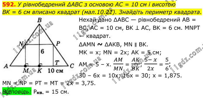 592. У рівнобедрений ∆ABC з основою AC = 10 см і висотою BK = 6 см вписано квадрат (мал.10.21). Знайдіть периметр квадрата. Нехай дано ∆ABC — рівнобедрений AB = BC, AC = 10 см, BK ⊥ AC, BK = 6 см. MNPT — квадрат. ∆AMN ~ ∆АКВ, MN ∥ BK. MK = х; MN = 2х; AK = 5 см; AM = 5 – х. AM/MN = AK/BK; (5- x)/2x = 5/6; 30 – 6х = 10x; 16х = 30; х = 1,875. MN = NP = PT = MT = 2х = 3,75. Відповідь: Pкв. = 15 см.