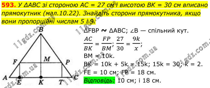 593. У ∆ABC зі стороною AC = 27 см і висотою BK = 30 см вписано прямокутник (мал.10.22). Знайдіть сторони прямокутника, якщо вони пропорційні числам 5 і 9. ∆FBP ~ ∆ABC; ∠В — спільний кут. AC/BK = FP/BM; 27/30 = 9k/x; BM = 10k. BK = 10k + 5k = 15k; 15k = 30; k = 2. FE = 10 см; FP = 18 см. Відповідь: 10 см; і 18 см.