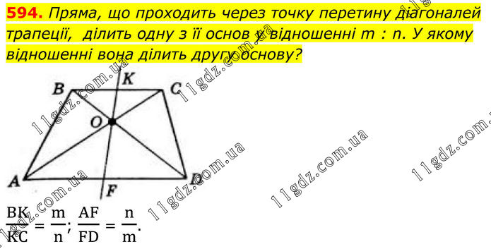 594. Пряма, що проходить через точку перетину діагоналей трапеції, ділить одну з її основ у відношенні m : n. У якому відношенні вона ділить другу основу? BK/KC = m/n; AF/FD = n/m.